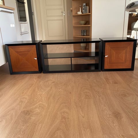 Modulopbygget reol i smukt træ med åbne kuber, skabe med låger og en sektion med tre skuffer. Reolen består af flere kvadratiske moduler, som kan opstilles samlet som på billederne eller omrokeres efter behov. De åbne rum kan anvendes til bøger, dekoration eller opbevaringskasser, mens skuffer og skabe giver lukket opbevaring. Velegnet til stue, kontor eller værelse, hvor der er behov for kombineret åben og lukket opbevaring. Enkelte af modulerne har synlige vandmærker, som kan slibes op eller vaskes ned.