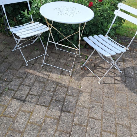Cafésæt bestående af rundt bord og to stole. Stel i aluminium og sæder/bordplade i trælameller. Sættet er velegnet til udendørs brug på terrasse, altan eller i have. Bordet har rund plade på søjlefod med tre ben, stolene har buet ryglæn og lameller i sæde og ryg. Den ene stol mangler et brædde på sædet og skal laves.