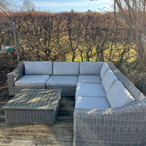 Brafab loungesæt med hjørnesofa og sofabord til udendørs brug. Hjørnesofaen er udført i flettet materiale med lyse, beige hynder på sæde og ryg. Sofabordet er i træ med lamelbordplade og krydsben. Sættet er egnet til terrasse eller have og giver siddeplads til flere personer i loungestil. Sælges samlet.