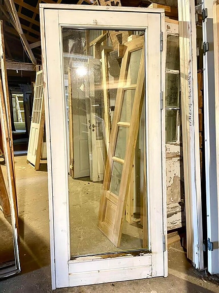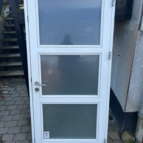 Brugt facadedør (terrassedør eller køkkendør) i smalt og lavt mål. Med 6-ruders vinduesparti med ruder i to-lags termoglas samt pæne fyldninger nederst.