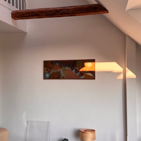 Abstrakt maleri med figurlignende motiver i grønne, gule, blå og røde nuancer. Maleriet er udført på lærred opspændt på træramme og indrammet i en enkel ramme. Bagsiden viser lærred og træramme med ophængssnor. Velegnet som vægdekoration i stue, kontor eller andre opholdsrum, hvor der ønskes et farverigt og udtryksfuldt kunstværk.