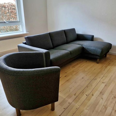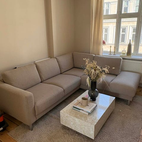 Vores sofa fra Ilva sælger vi pga. flytning. Den er ca. 2.5 år gammel. Der følger en nakkestøtte-pude med som man kan flytte rundt på. Sofaen kommer fra et ikke-ryger og ikke-dyrehjem. Puderne følger ikke med.