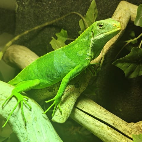 Han er en stor argentinsk tegu. Han er ca de 3 år gammel.