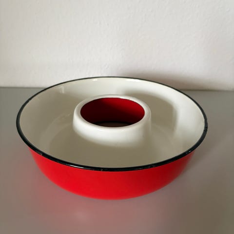 Retro randform i gul emalje. 21 cm i diameter. Med lidt afskalning på kanten.