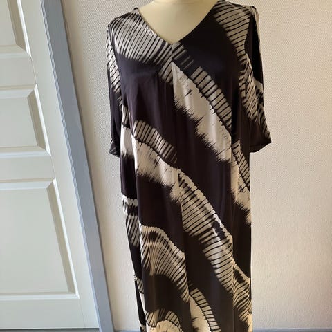Culture hverdagskjole til dame i størrelse L. Kjolen er fremstillet i viskose og har et multifarvet mønster med prikker i blandt andet rød, hvid og gylden på mørk bund. Modellen har V-udskæring og lange ærmer. Velegnet som hverdagskjole eller til mere afslappede anledninger.