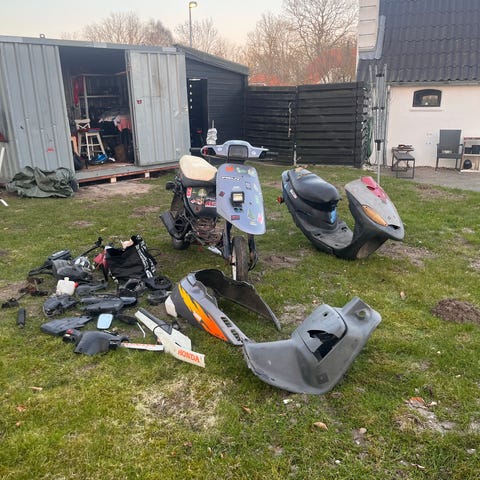 Sælger denne yamaha earox 4 takt den sælges pga jeg har været ude for et trafik uheld og motoren starter hvergang og står perfekt i tomgang. Komplet skjold skal skiftes ,Der er også andre dele der er brugbar men stel og forgaffel er trukket så meget så tror ikke det kan laves så hvis du har et stel så kan du sætte motore. Hen på og div dele ,Scooter stel og motor sælges samlet. Billederne viser baghjul, affjedring, motorblok, udstødning og dele af stellet. Speedometeret viser 3.221,6 km. Flere plastdele og front er afmonteret eller mangler. Egnet som reservedelsdonor eller projekt for den teknisk kyndige. Mærke og model fremgår ikke tydeligt af delene og er derfor ikke specificeret.