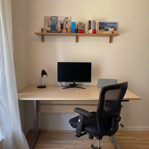 Stort hæve/sænke skrivebord, som er blevet brugt til erhverv tidligere. Bordet justeres med elektrisk motor og har en skinne til ledninger. Enkelte brugsspor, men i god stand.