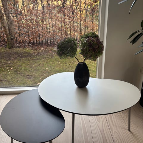 Hvid laminat bordplade sorte bordben i træ.
