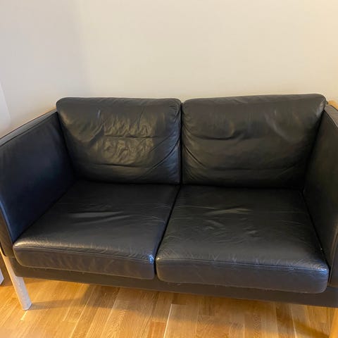 Sort lædersofa med et minimalistisk design og bløde, komfortable puder. Sofaen har en robust træramme, der giver et tidløst udtryk.,Bemærk at mail, chat og beskeder ikke besvares, og varen skal købes på knappen "Gå til varen"