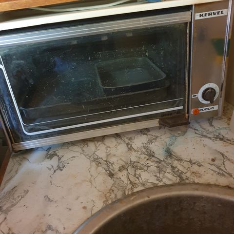 Kervel DG 3000 ovn. Bordmodel med glaslåge og mekanisk drejeknap på fronten til indstilling af temperatur/tid. Kabinettet er i metal. Ovnen er brugt men pæn og ren. Vi har haft stor glæde af den som ekstra ovn til udvidet madlavning. Der medfølger bageplade, bradepande og rist. Ovnen rummer 30 liter. Indvendige mål: h24, b40, d24 cm. Udvendige mål: h33, b56, 36 cm.