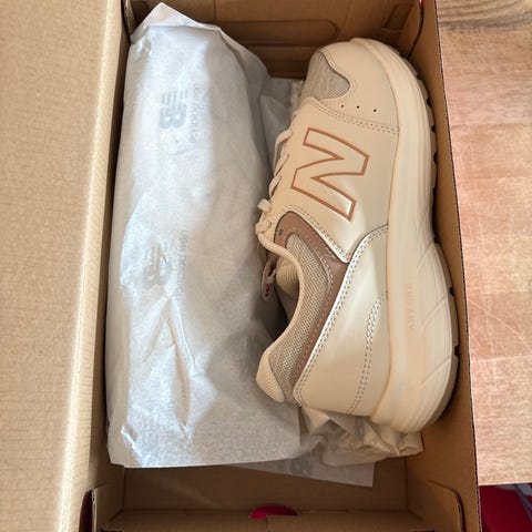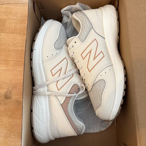 New Balance WW550 løbesko i str. 36. Modellen er en bred udgave (2E) og egner sig til løb. Skoene er i en lys beige farve med snørelukning og gummisål med mønster for greb. Overdelen er i en kombination af tekstil og syntetisk materiale for støtte og åndbarhed. Velegnet som løbesko eller til hverdagsbrug, hvor der ønskes en sportslig sko i mindre størrelse.