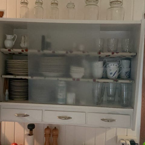 Københavnerskab med matterede glaslåger og 6 glasskuffer.