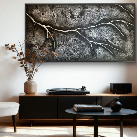 Et tidløst og eksklusivt maleri. ✨ hvor sort elegance og sølvets organiske bevægelse smelter sammen. Værket tilfører rummet karakter uden at dominere – en diskret luksus, skabt til hjem og rum, hvor kvalitet og ro er i fokus.
