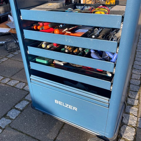 7 skuffer fyldt med værktøj.