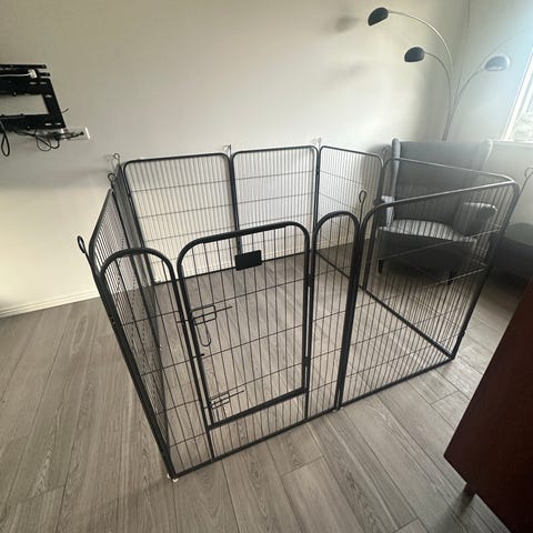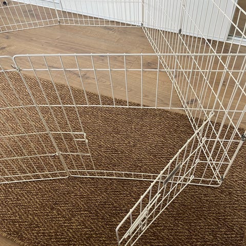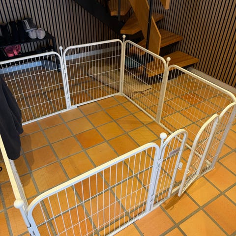 Hvalpegård fra ollipet. Består af flere sektioner, der kan opstilles i forskellige former, f.eks. som indhegning på terrasse eller i have. Hvalpegården har låge med lukkeanordning. Velegnet som indendørs eller udendørs indhegning til hvalpe eller mindre hunde. Kan foldes sammen for lettere opbevaring og transport.