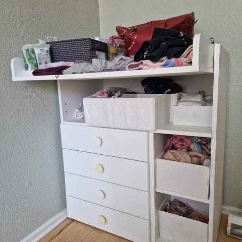 Fint og praktisk puslebord med to rummelige skuffer og to hylder. Aftagelige sidebeholdere med plads til f.eks. sutter, vatrondeller, cremer, vand etc følger med.