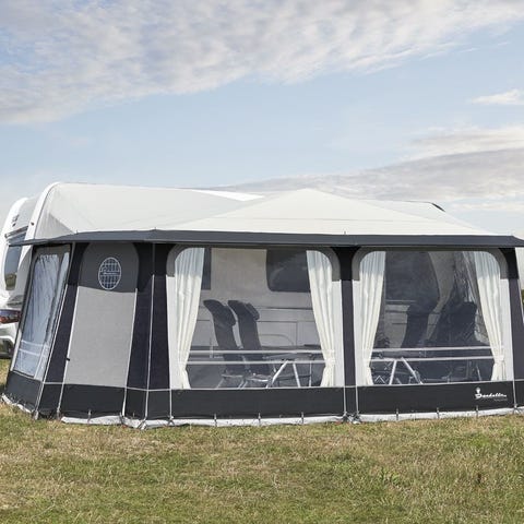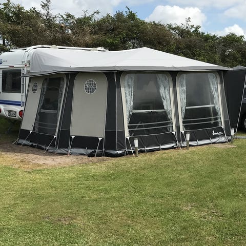 Isabella Penta fortelt i grå farve. Forteltet er et klassisk Penta-helfortelt med store vinduer i front og sider. Etiketten angiver model Penta, A-mål 850 og farve sky-grey. Leveres med tilhørende stænger i separate stangposer samt tilhørende gardiner og gulvtæppe.