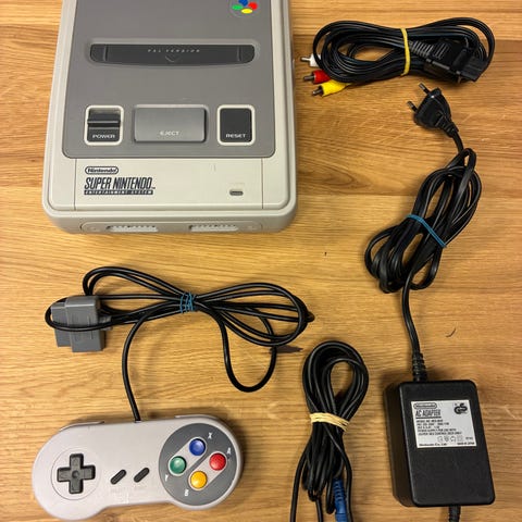 Super Nintendo med 1 controller, kabler og spil