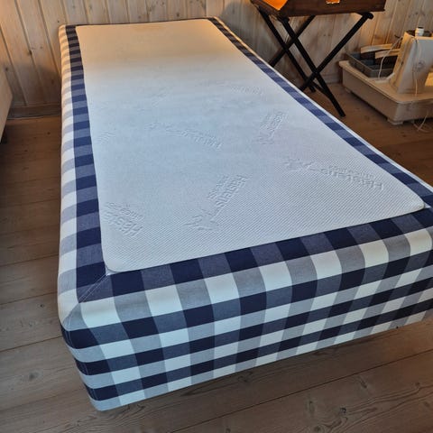 Sengen har klassisk lysternet betræk og er udført i Hästens’ karakteristiske materialer med fokus på komfort og støtte.