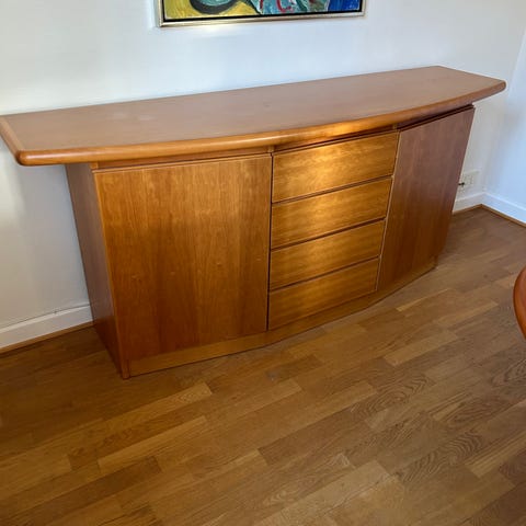 Købt i 2004 i Træfalke møbler. 2 skænk 360 cm i gråbejdset eg. Har 2 dropdown låger og 2 skuffer i midten.