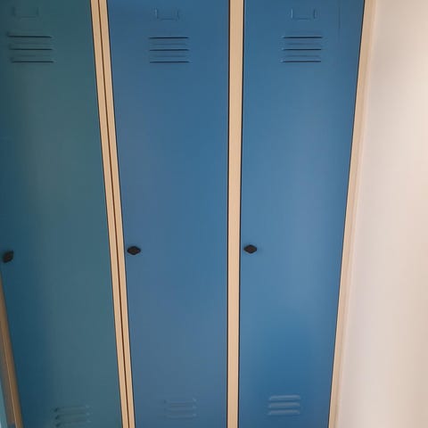 Kvalitets omklædningsskab. God stand. Højde 205, bredde 120, dybde 55cm. Locker room garderobe skab, ventilationsriller i top og bund af lågerne. Indrettet med hattehylde, bøjlestang og 3 håndklædekroge. Nypris mellem 5000 - 6000 kr.