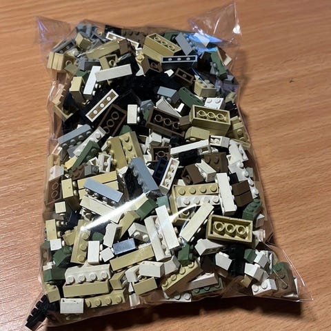 Parti med Modulex klodser i forskellige farver og størrelser. Vægten er 2623 gram. Der medfølger også en sorteringsbakke og et skilleredskab