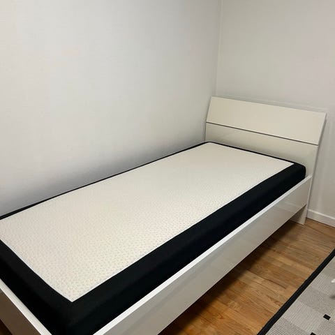 Enkeltseng med hvid topmadras. Sengen består af en mørk sengebund og en lys, quiltet topmadras. Velegnet som enkeltmandsseng i soveværelse, gæsteværelse eller ungdomsværelse. Sengen er placeret direkte på gulvet uden synlige ben på billedet. Ingen yderligere specifikationer om mål, materiale eller mærke er oplyst.