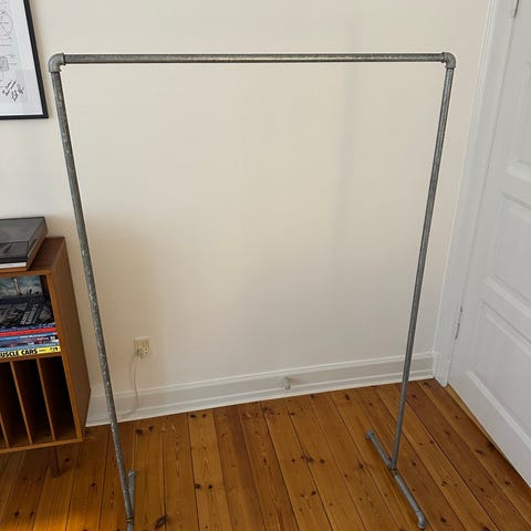 Rustikt tøjstativ af solide vandrør i galvaniseret stål. Har været brugt i tøjbutik. Stativet har hjul hvoraf 2 af dem kan låses.