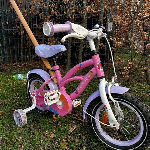 Børnecykel med 12" hjul i pink farve. Cyklen har kædeskærm, støttehjulsfæste, skærme foran og bagpå samt håndbremse. Egnet til mindre børn, der skal lære at cykle på en lille cykel med lave stelrør og lige styr.