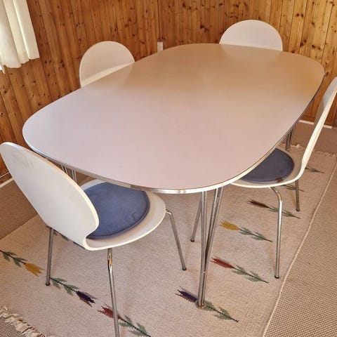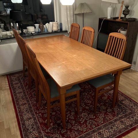 Flot spisebord og 6 spisebordstole. Nemme at rengøre og har en flot farve. Godt med benplads og siddeplads. Sættet har brugsspor som det fremgår på billederne, men er stadig i god stand og fejler ikke noget derudover.