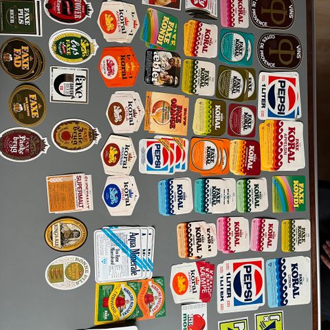 Samling af retro Faxe Kondi etiketter i forskellige størrelser og varianter, bl.a. reklame- og kampagneetiketter.