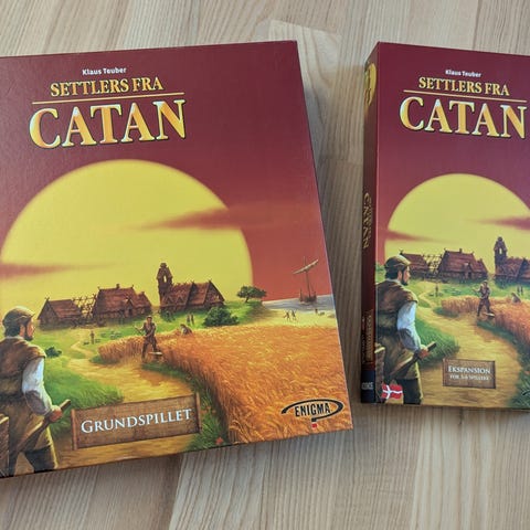 Catan grundspil brætspil. Strategisk brætspil hvor spillerne opbygger bebyggelser, veje og byer på øen Catan ved hjælp af ressourcer som træ, ler, uld, korn og malm. Spillet indeholder modulopbygget spilleplade med sekskantede felter, kort, spillebrikker og terninger. Egnet til flere spillere og kan spilles som selvstændigt spil eller kombineres med udvidelser til Catan-serien.
