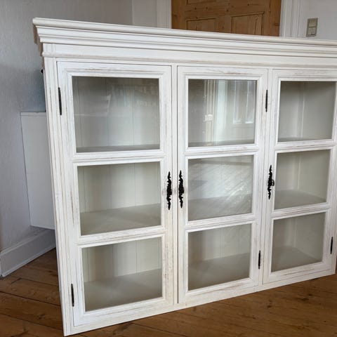 Vitrineskab i grøn farve med øverste del med glaslåger og nederste del med lukkede låger. Skabet har flere indvendige hylder til opbevaring og udstilling af fx glas, service eller pynt. Lågerne er udstyret med lange greb i metal. Velegnet til stue, spisestue eller køkken-alrum som opbevarings- og udstillingsmøbel.