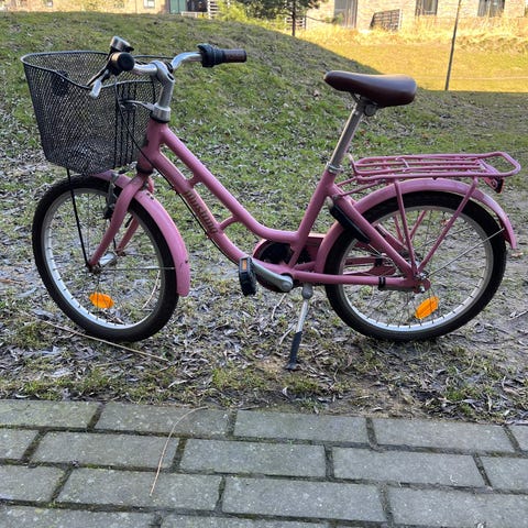 Børnecykel med 20" hjul i turkis farve. Cyklen har lav indstigning, fastmonteret frontkurv i metal og bagagebærer. Udstyret med kædeskærm, skærme for og bag samt støtteben. Egnet til børn, der passer til 20" hjulstørrelse.