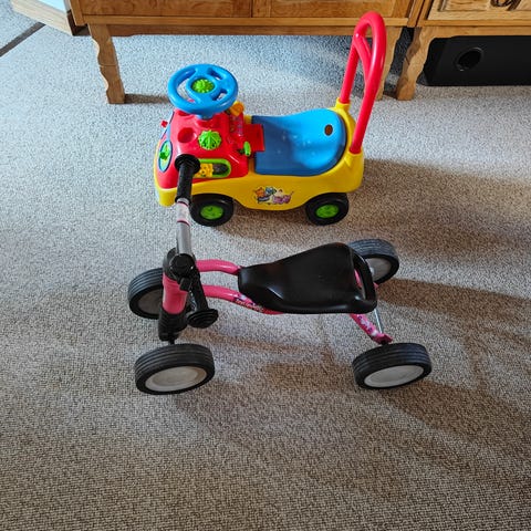 Løbecyklen har brugsspor og enkelte skrammer, men den har altid stået overdækket og tørt, så der er ingen rust eller lign.