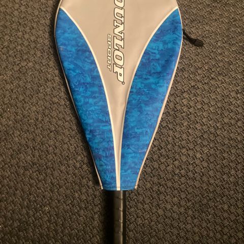 Dunlop Graphite Ti tennisketcher med tilhørende cover. Ketcheren har blå og sorte detaljer og strenget hoved med Dunlop-logo. Coveret er hvidt med blå felter og teksten "graphite ti". Egnet til tennis og leveres med beskyttende cover til opbevaring og transport.