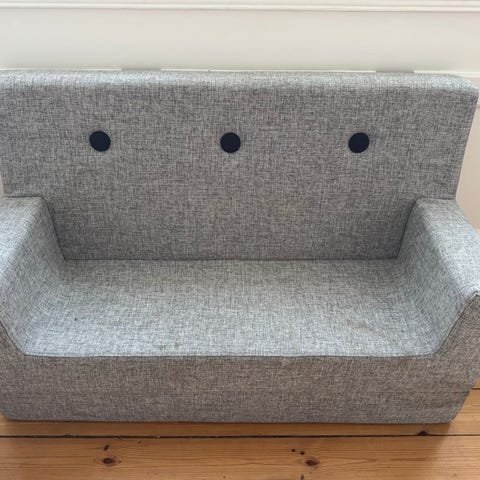 By KlipKlap børnesofa i farven mørk blå med grønne knapper. Kan foldes ud så barnet har mere plads til at ligge i den.