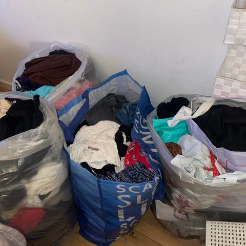 En sæk fyldt med tøj. Størrelse S-M 36-38. Kan hentes i Lyngby eller Frederiksværk. Billeder viser et lille udpluk af tøjet. Der er minimum 200 dele tøj i alt.