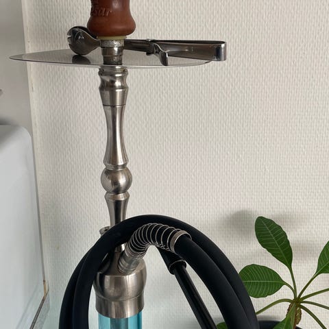 Shisha vandpibe med dekorativ glasfod i grålige nuancer og sort søjle. Vandpiben har flere slangeudgange og leveres med en fleksibel silikoneslange samt mundstykke. Øverst er der lerhovede og kulbakke. Egnet til brug udendørs eller indendørs på bord eller terrasse.