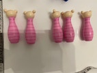Andet legetøj, Bowling Sæt I Træ, 5 lyserøde farve bjørne kegler i træ ( det mangler kuglen )