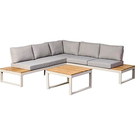 Dette rummelige og stilrene loungesæt består af en lounge hjørnesofa med et dertilhørende loungebord. Stellet er fremstillet i aluminium, med overflader af teak hvilket sikrer at det kan holde i flere sæsoner og samtidig er relativt vedligeholdelsesfrit. Dette loungesæt passer ind på enhver terrasse og kan sørge for mange hyggelige stunder i det danske sommervejr!