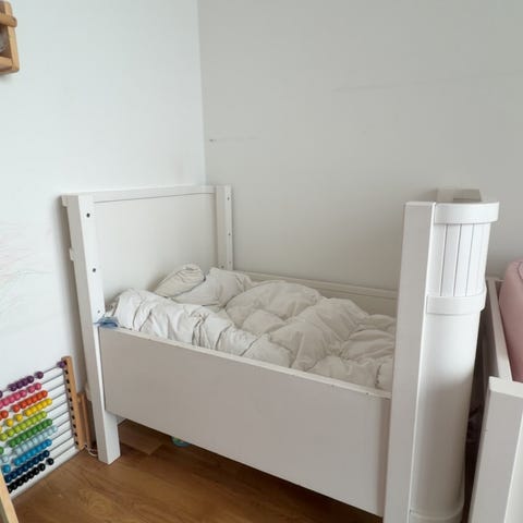 Juniorseng med udtræk i hvidmalet træ. Sengen har ryglæn og sidegelænder samt en ekstra udtræksseng under hovedsengen. Egnet til brug som juniorseng eller dagseng i børneværelse eller gæsteværelse. Overfladen viser mindre brugsspor på enkelte kanter og lister, som ses på billederne.
