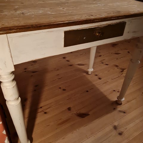 Fint gammelt bord med brugsspor. Virkelig kært lille bord med svungne bed og tre skuffer (uden nøgle) men åbne.