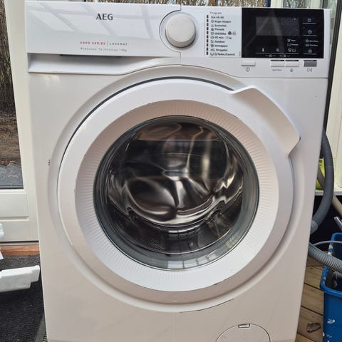 AEG frontbetjent vaskemaskine i hvid. Maskinen har frontbetjent låge og kontrolpanel med drejeknap og display. Flere vaskeprogrammer og tilvalg kan vælges via panelet, herunder standardprogrammer til bomuld, syntetisk og skånsom vask. Egnet til almindeligt husholdningsbrug i bryggers, badeværelse eller vaskerum. Maskinen tilsluttes vand og afløb via bagsiden og kræver almindelig strømtilslutning.