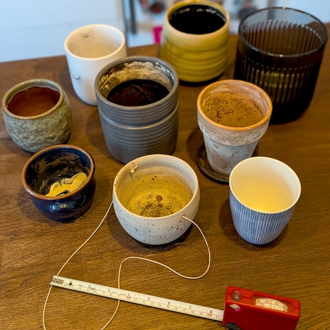 3 store terracotta krukker med underskål