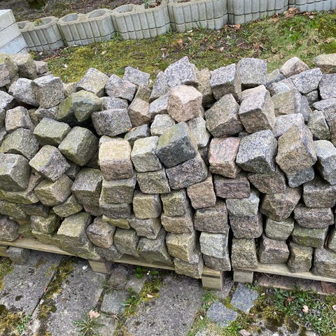 Der er ca 33 stks granit brosten I størrelsen 18×18 cm (de har lidt variende størrelser) som sælges billigt da de er kommet I overskud efter renovering.
