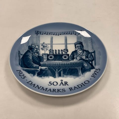 DR har i år 2025 100 års jubilæum, her er DR 50 år, Royal Copenhagen, 1975, Royal Copenhagen Mindeplatte fra 1975, Danmarks Radio 50 år 1925-1975. 1. sortering. Diameter 18,0 cm.