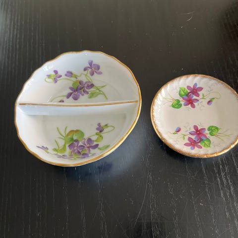 Antik Staffordshire blomsterskål, håndmalet med violer og lyserøde blomster.