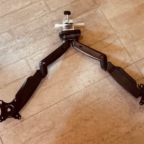 Dobbelt skærmarm til montering på skrivebord. Armen spændes fast til bordet. Man kan justere højde, vinkel, og orientering (landskab/portræt) Der medfølger to VESA-beslag til montering af skærme.