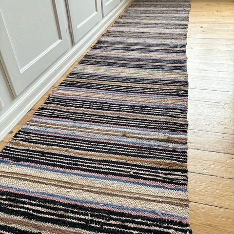 Gammelt svensk kludetæppe i lyse, beige og lysegule nuancer.